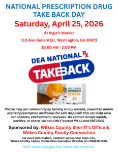 Join us on Saturday, April 25, 2026, at the Ingle’s Market in Washington, GA for the National Prescription Drug Take-Back Day from 10:00 AM – 2:00 PM. Please help our community by bringing any unused, unwanted, and/or expired prescription medications for safe disposal. This can help save our children and families, environments, and pets. We ONLY accept PILLS and PATCHES – no liquids, needles, or sharps.