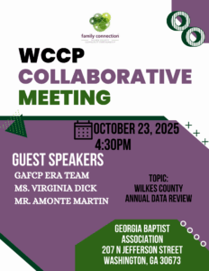 Please join us for the Wilkes County Community Partnership’s October 2025 Collaborative Meeting scheduled for Thursday, October 23, 2025, at 4:30 PM at the Georgia Baptist Association. See you there!